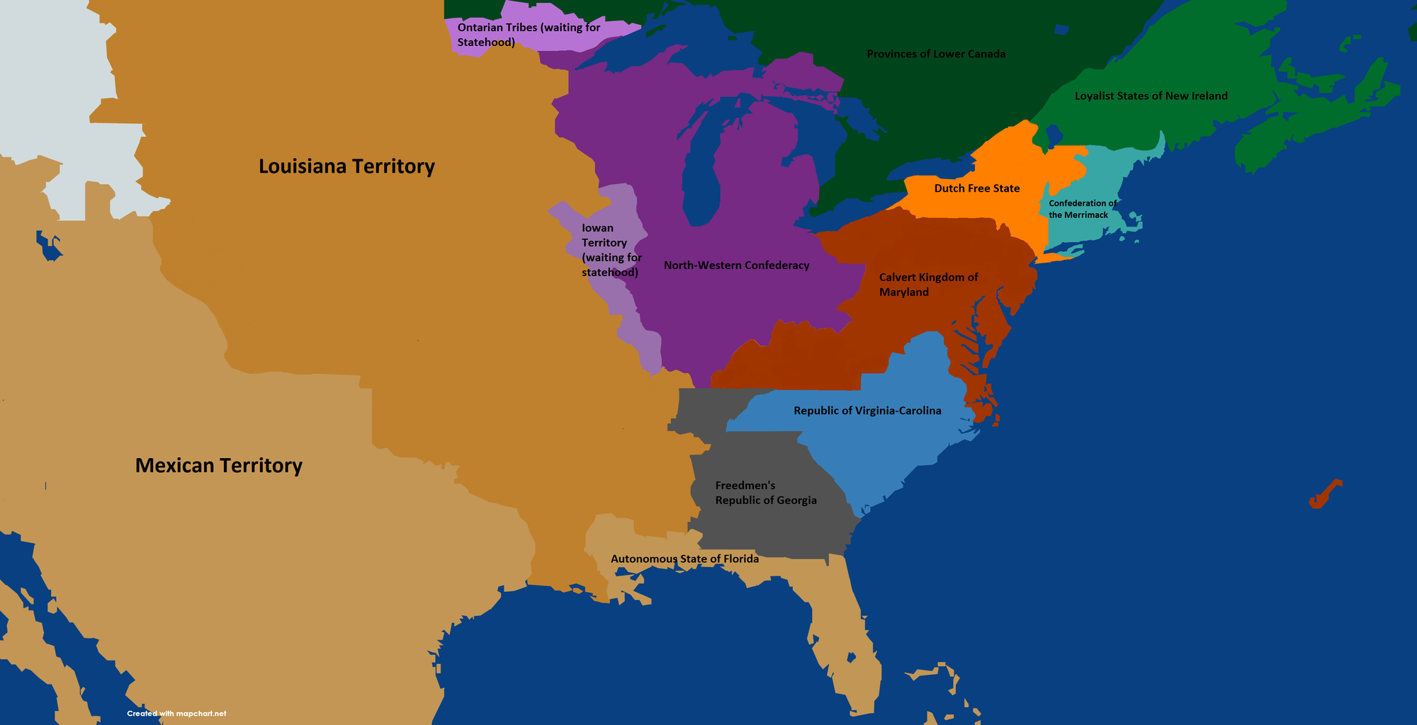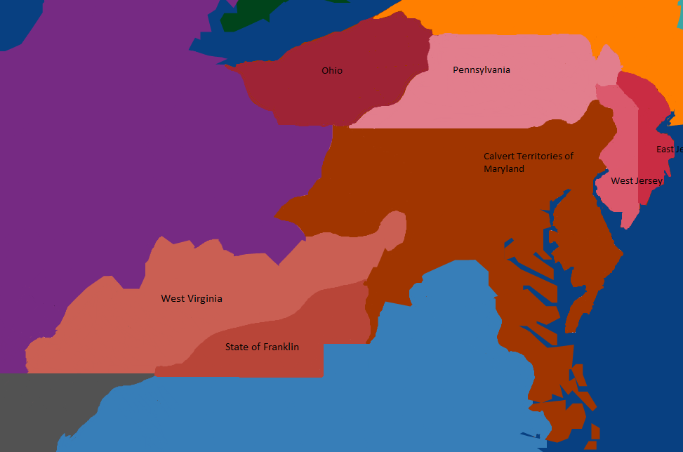 But anyways, I made a map that makes Henry Harford succeed in his endeavors, but also expanding the Marylander Empire through Pennsylvania, Virginia, and Ohio. I also added other new states that were just there as other competitors in the New World where the American Experiment ended.